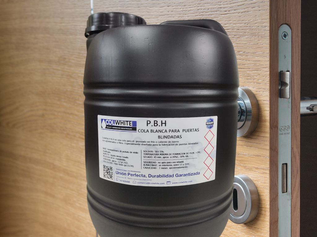Cola blanca especial para puertas blindadas de hierro y para el encolado de determinadas chapas metálicas previamente desengrasadas con tablero o madera.