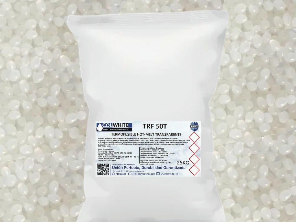 TRF 50T es un Hotmelt transparente adecuado para el pegado de madera natural, aglomerado, MDF con